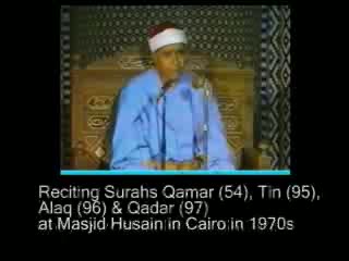 Shaikh Mostafa Ismail recites Surahs Qamar, Tin, Alaq and Qadr of the Holy Quran; Live in Masjid Husain, Cairo Egypt. This is an initial attempt by the students of Leeds Makkah Masjid to add the translation of the recited Surahs in the video. More videos of Sheikh Mustafa Ismael available at www.QuranReciters.com